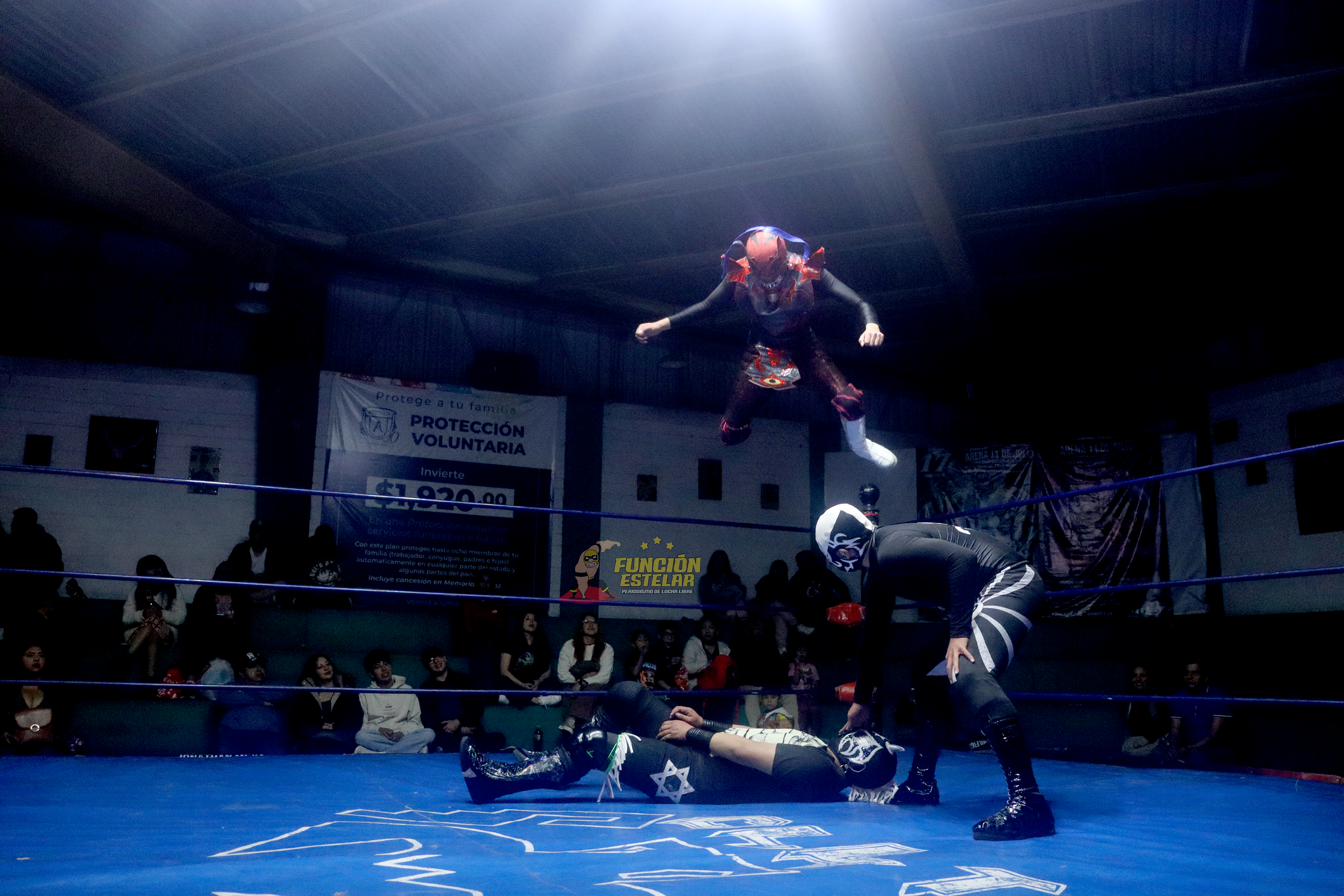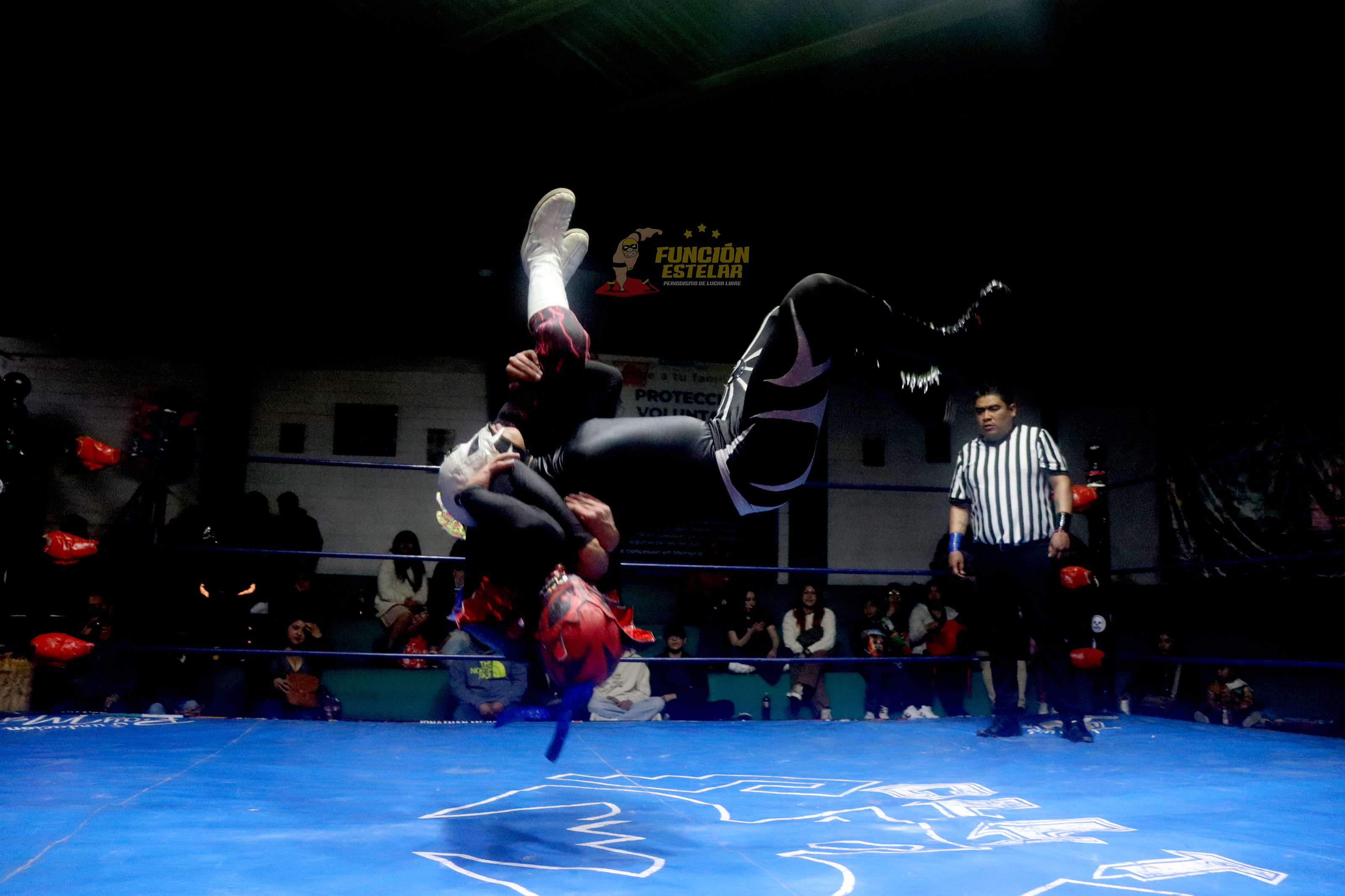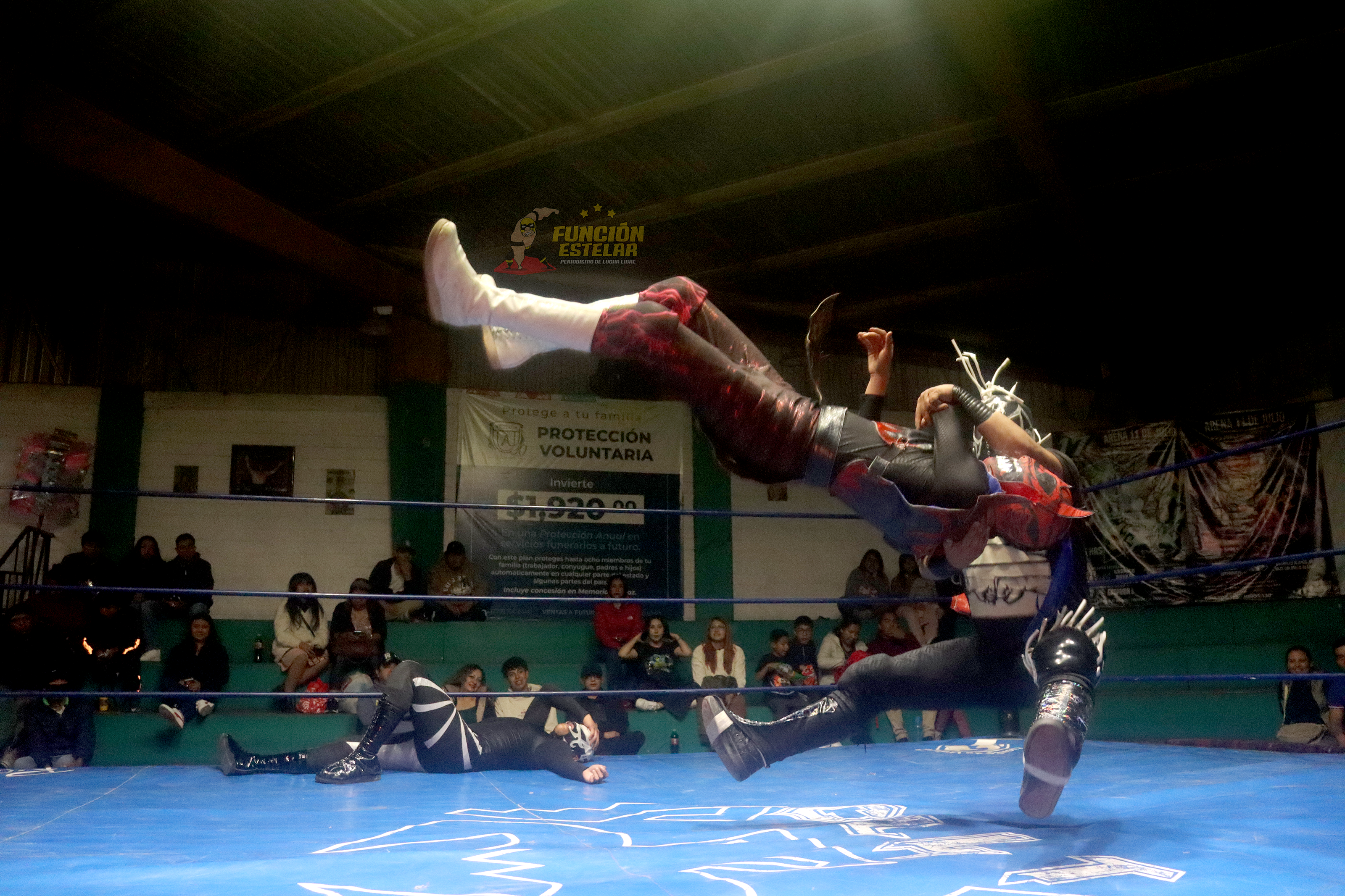 Los movimientos de los tres gladiadores comenzaron a tambor batiente, arriba del ring, desarrollaron aplicar desnucadoras y variantes de azotones sobre el cuadrilátero, pero además desarrollaron lances y vuelos suicidas, los cuales robaron la admiración del público presente.