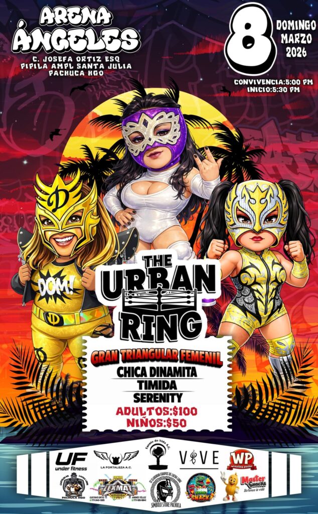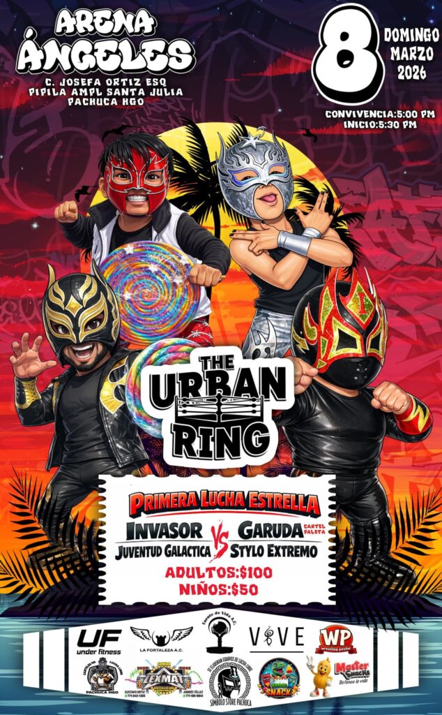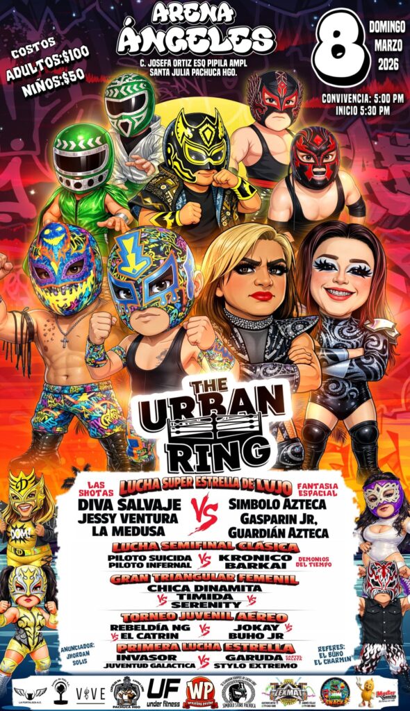 La adrenalina de la lucha libre volverá a sentirse con fuerza el próximo domingo 8 de marzo de 2026, cuando la promotora The Urban Ring presenta una función llena de talento, rivalidades y espectáculo en la Arena Ángeles, ubicada en la calle C. Josefa Ortiz esquina Pípila, en la colonia Ampliación Santa Julia de Pachuca.